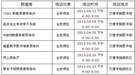 为了配合本院师生教学与科研的需要,有效提高本馆已购数据库的使用,图书馆参考咨询部特邀请CNKI、起点、中经网、超星数字图书馆、网上报告厅、新东方数据库将于4月11日、4月18日、4月25日、5月9日、5月16日及5月23日等各周四下午为公司师生举办系列数据使用方法库培训,主要讲解各数据库的使用方法和检索技巧,目的是帮助广大师生学会查找各类中外文文献资料的方法,提高个人获取学术信息的能力。讲座现场将有小礼品赠送!望广大读者踊跃参加!并积极做好宣传工作。