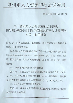 接荆州市人力资源和社会保障局《关于转发省人力资源和社会保障厅做好城乡居民基本医疗保险制度整合过渡期间有关工作的通知》[荆人社函(2016)103号]要求,荆州市2017年城乡居民医保个人缴费标准统一为150元/人/年。