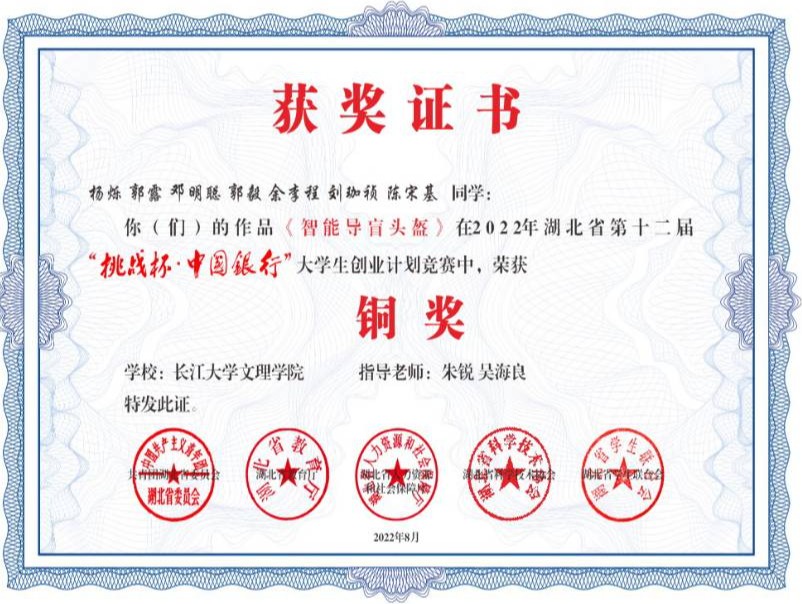 本网讯(通讯员 朱锐) 日,从湖北省第十二届“挑战杯·中国银行”老员工创业计划竞赛组委会获悉,由公司朱锐、吴海良老师指导,机械5201班杨烁为队长的参赛团队获得铜奖。