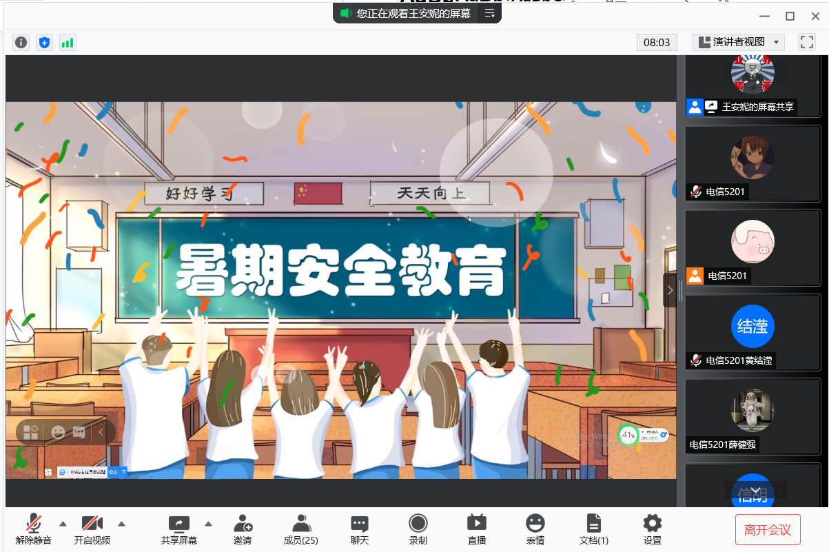 会议开始,主持人通过视频和PPT带领同学们学习了交通安全、防溺水、食品安全和疫情防范等方面的安全知识,详细讲述了暑假期间存在的一些安全隐患以及相应的解决措施。随后,辅导员要求同学们做到文明离校、注意饮食健康、乘坐正规交通工具、谨防上当受骗,持续每天在今日校园打卡签到,并祝大家假期愉快。