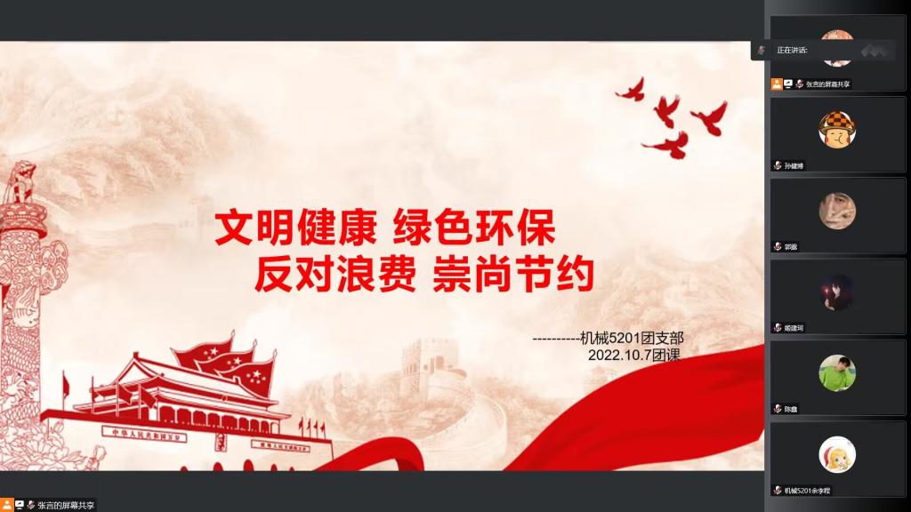 本网讯(员工记者 徐果)近日,我系开展“文明健康 绿色环保,反对浪费 崇尚节约”线上主题团课。团课由各班团支书主持,班级全体同学参加。