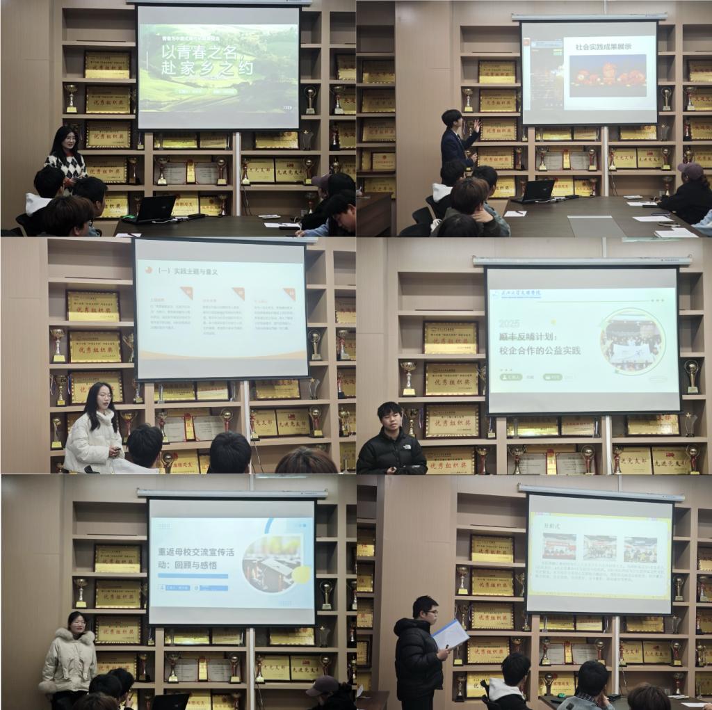活动伊始,主持人任静茹通过多媒体导览系统介绍展评规则。公司党总支副书记王大专老师作为评委代表讲话,他强调,社会实践是青年员工深入基层、锤炼品格的重要途径,勉励同学们在服务社会中实现自我成长。根据赛前抽签顺序,郑天资、陈湫杙等6位候选人依次登台,通过PPT图文展演还原实践场景,展示中既有“返家乡”学子参与基层治理的履职纪实,也有“爱心托管班”志愿者与儿童的暖心互动。展示结束后,评委小组从实践价值、成果转化、答辩表现等维度进行现场评分。