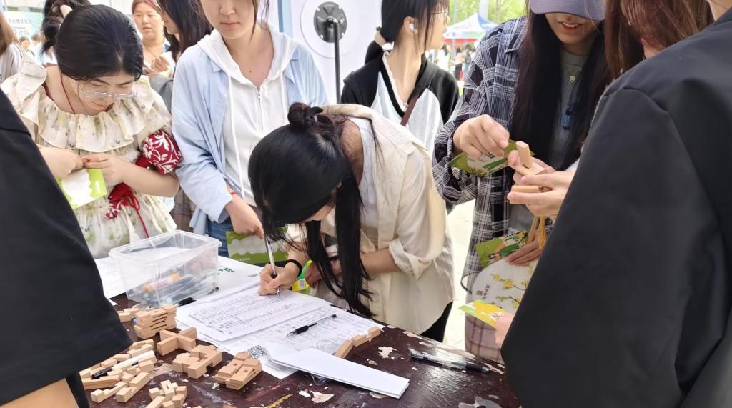 “解鲁班锁”区域围满了好奇与挑战欲十足的员工。参与员工转动幸运大转盘,找工作人员领取对应的鲁班锁,通过观察榫卯结构,思考与尝试,将复杂的部件拆解或进行重新组装。看似简单的木块,实则暗藏玄机,这不仅考验着同学们的空间思维能力,更是一场耐心与专注力的挑战。