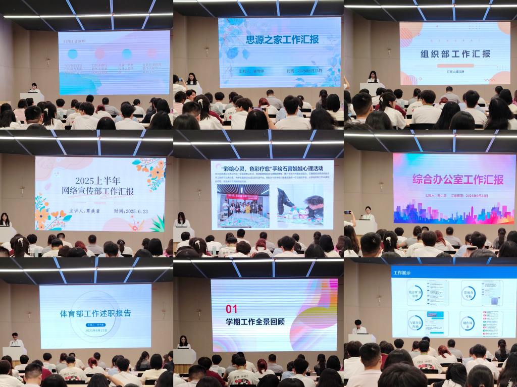 会议伊始,各部门依次进行工作汇报。学习部围绕日常查课率、到课率、抬头率“三率”检查工作及周汇总表、考核表制作等进行总结;权益保障部从学期工作全景回顾、成效与不足、未来突破方向三个维度展开汇报。此外,体育部、心理部、网络宣传部等部门也就各自工作进行了详细汇报,全面总结了上半年工作成效,客观指出了在团队协作、创新意识等方面存在的不足,并提出了针对性改进措施,对未来员工工作进行了规划。随后,员工会主席王盛博代表主席团汇报了员工会整体工作。接下来,会议对优秀员工干部及干事予以表彰,充分肯定了他们在员工会工作中的突出表现,并号召全体成员学习先进。
