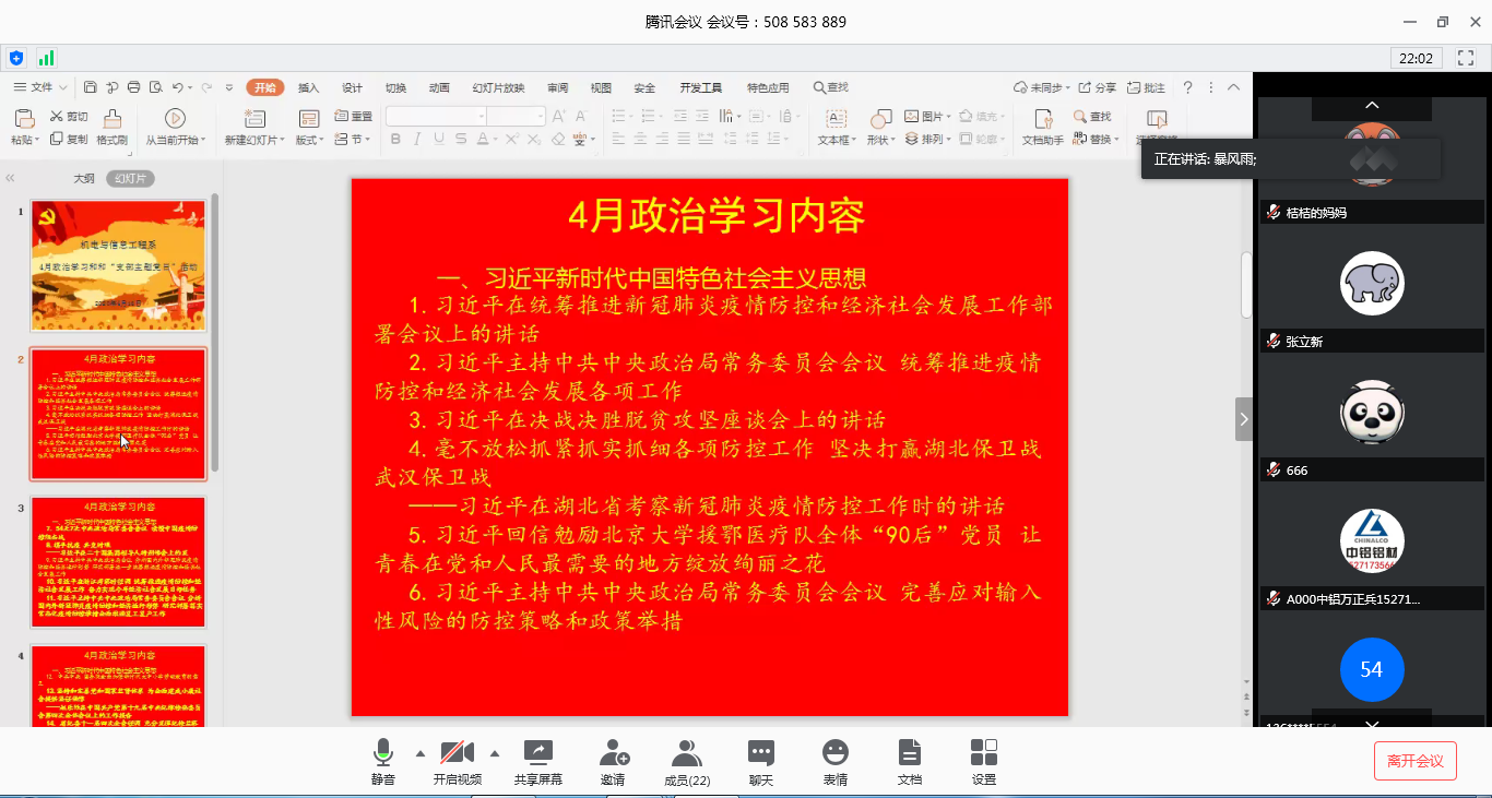 本网讯(通讯员 成观雄)4月16日19点,我系教工党支部组织召开4月份政治学习和“支部主题党日”活动,会议在腾讯会议线上进行,由教工党支部书记呙明辉主持。