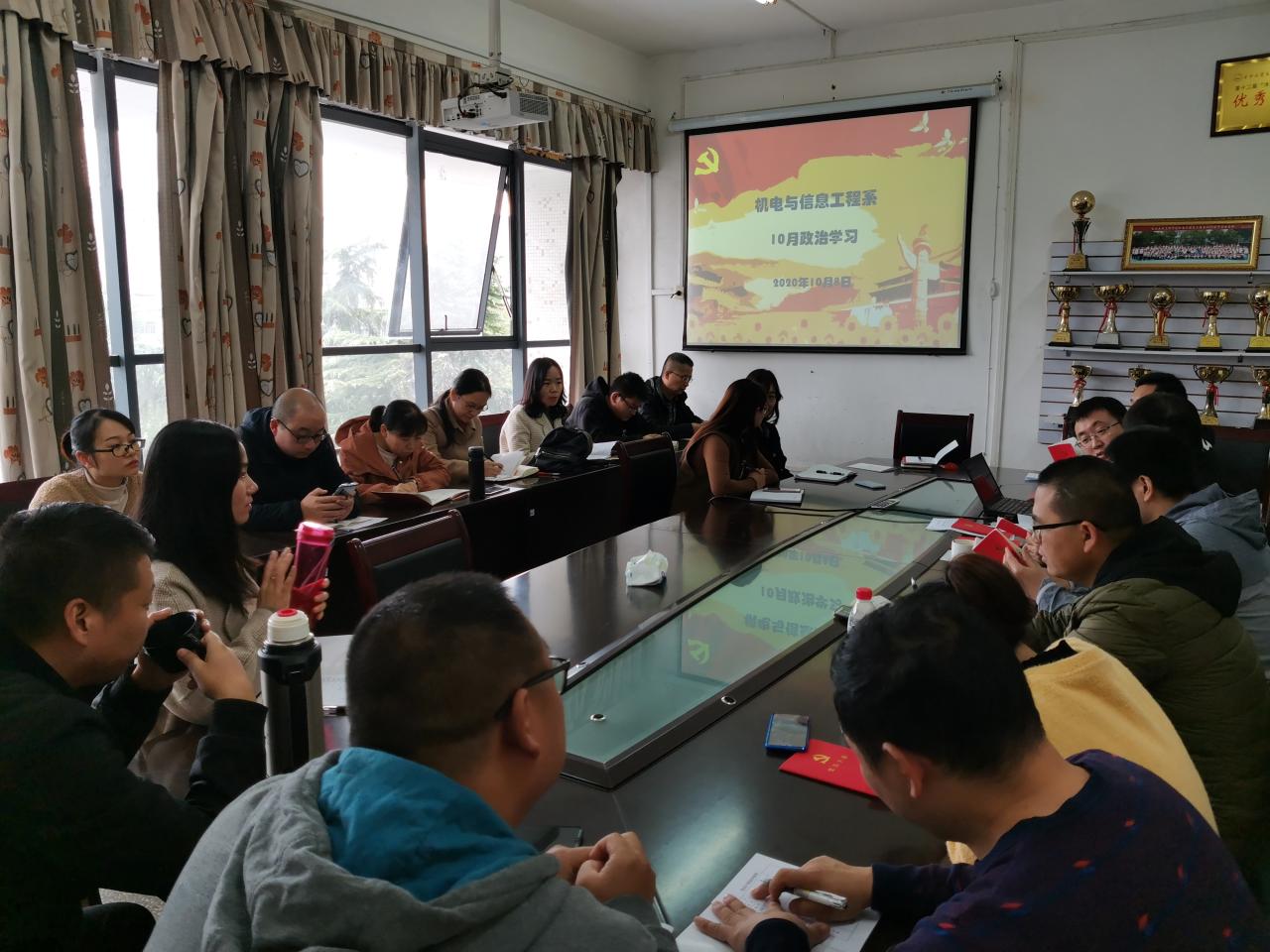本网讯(通讯员 成观雄)10月8日下午14点30分,我系党总支在会议室召开学习会,开展10月份政治学习和“支部主题党日”活动。会议由教工党支部书记呙明辉主持。