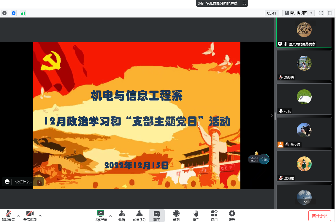 政治学习阶段,呙明辉带领大家集体学习党的二十大报告第五部分“实施科教兴国战略,强化现代化建设人才支撑”、党的二十大报告学习辅导百问、《习近平关于社会主义精神文明建设重要论述摘编》、《总体国家安全观学习纲要》内容解读、习近平总书记关于军民融合发展的重要论述、习近平在中央统战工作会议上的重要讲话;习近平总书记主持召开中共中央政治局常务委员会会议,听取新冠肺炎疫情防控工作汇报,研究部署进一步优化防控工作;关于进一步优化落实新冠肺炎疫情防控措施的通知;在坚持中赢得战略主动——近三年来我国打好疫情防控攻坚战述评;现行宪法公布施行40周年:保障中华民族实现伟大复兴的根本法;中华人民共和国个人信息保护法;中共中央关于印发《中国共产党处分违纪党员批准权限和程序规定》的通知等重要内容。