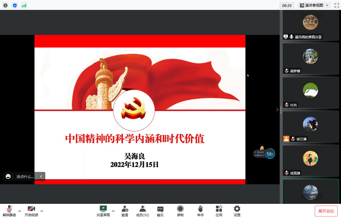 随后,公司党总支书记吴海良以《中国精神的科学内涵和时代价值》为题讲授党课,他从“什么是中国精神?”“中国精神有何时代内涵?”“中国精神有何价值意蕴?”三个方面强调了“要实现中国梦必须弘扬以爱国主义为核心的民族精神和以改革创新为核心的时代精神!”.
