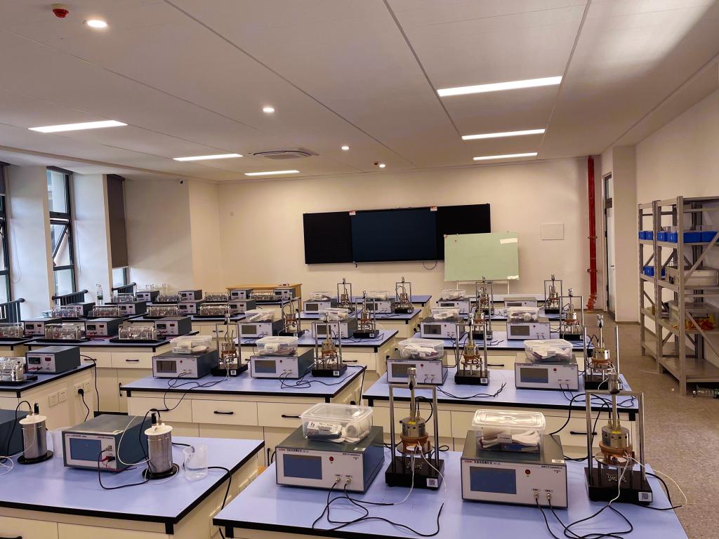 物理电学实验室新建于2022年,现有教学面积120平米,拥有各类先进仪器设备总价值约37万余元,各类电学仪器台套数58台。每学年承担全院理工科员工近500人物理电学实验教学任务。