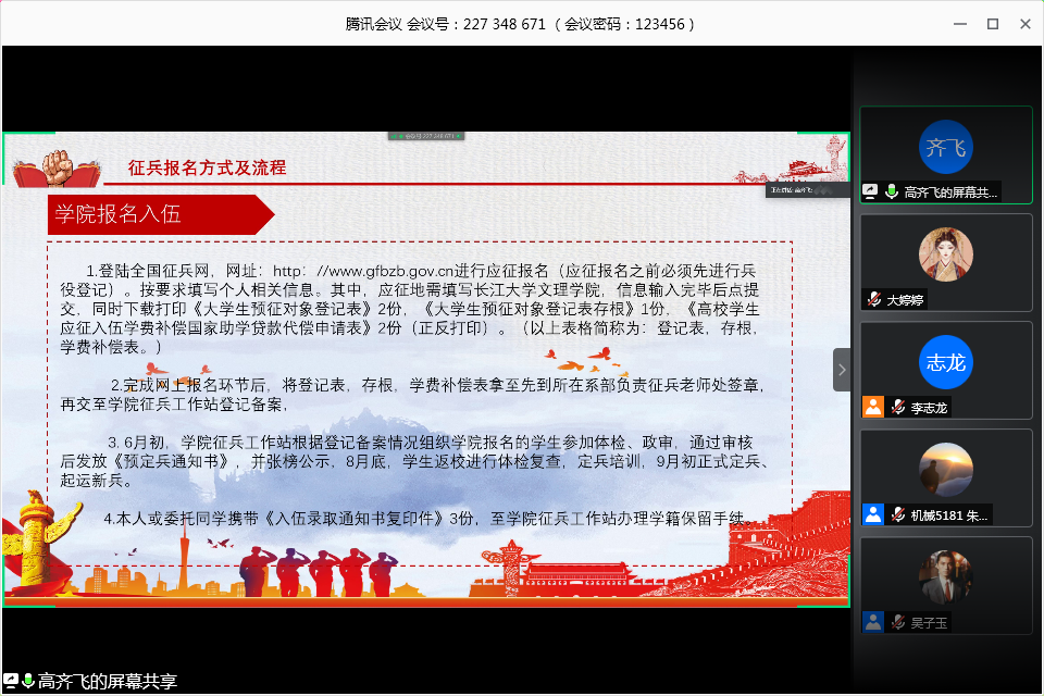 本网讯(员工记者曲孝佳)为加强征兵政策宣传力度,鼓励老员工入伍参军,5月17日晚,在腾讯会议平台,我系开展2020年老员工线上征兵宣讲活动。300余名师生一同参加。