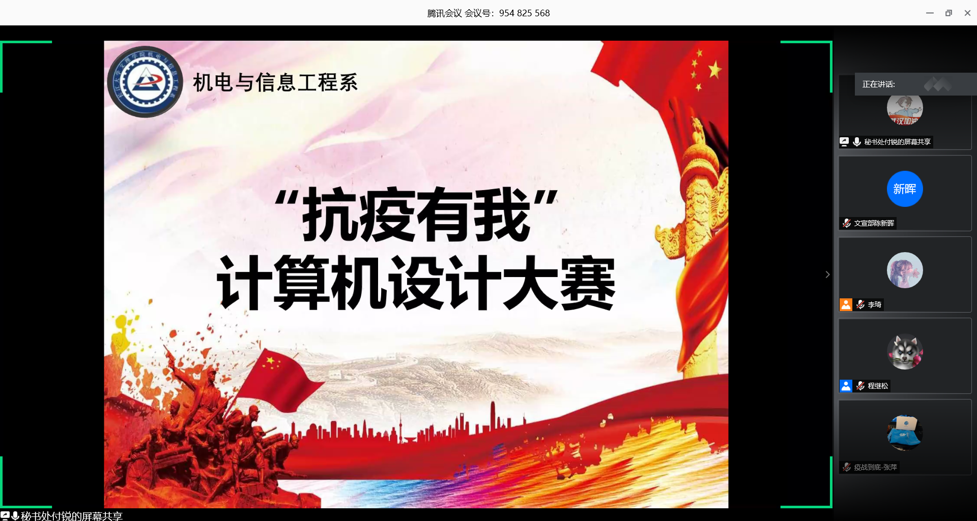 本网讯(员工记者黄懿萱)5月18日晚,在腾讯会议平台,由我系承办的第十四届科技文化节之“抗疫有我”计算机设计大赛圆满收官。本次大赛特邀系党总支书记吴海良、公司办公室副主任邓士明、教学工作部副部长刘杰、计算机教研室主任熊守丽、机械教研室主任朱锐五位老师担任评委,百余名师生在线观看。