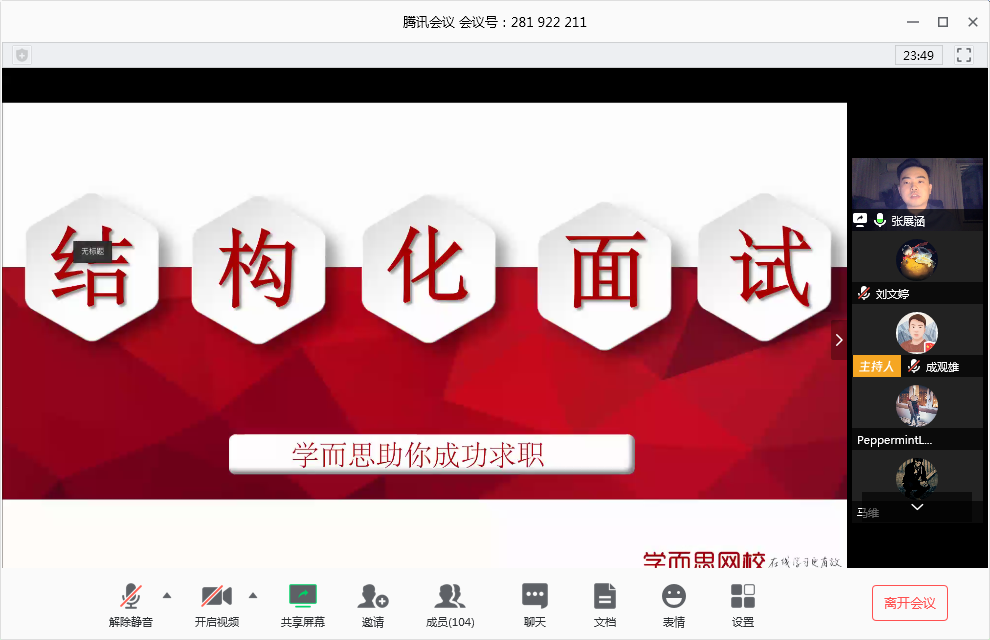 会议中,学而思网校教师张展涵围绕“结构化面试”、“能力三核”、“六种面试问题”、“对应解决方法”四方面进行阐述,详细讲解毕业学子在投递简历和参与面试时的普遍问题和缺点,并针对各种现象给出良好的改善方案。他表示,提前了解投递公司的基本信息,明确自己的职业规划,做足准备;简历内容一定要突出自身特点,并符合投递职务要求;面试时,不管是线上还是线下,需注意礼仪、举止,做到端庄大方、稳重自信。