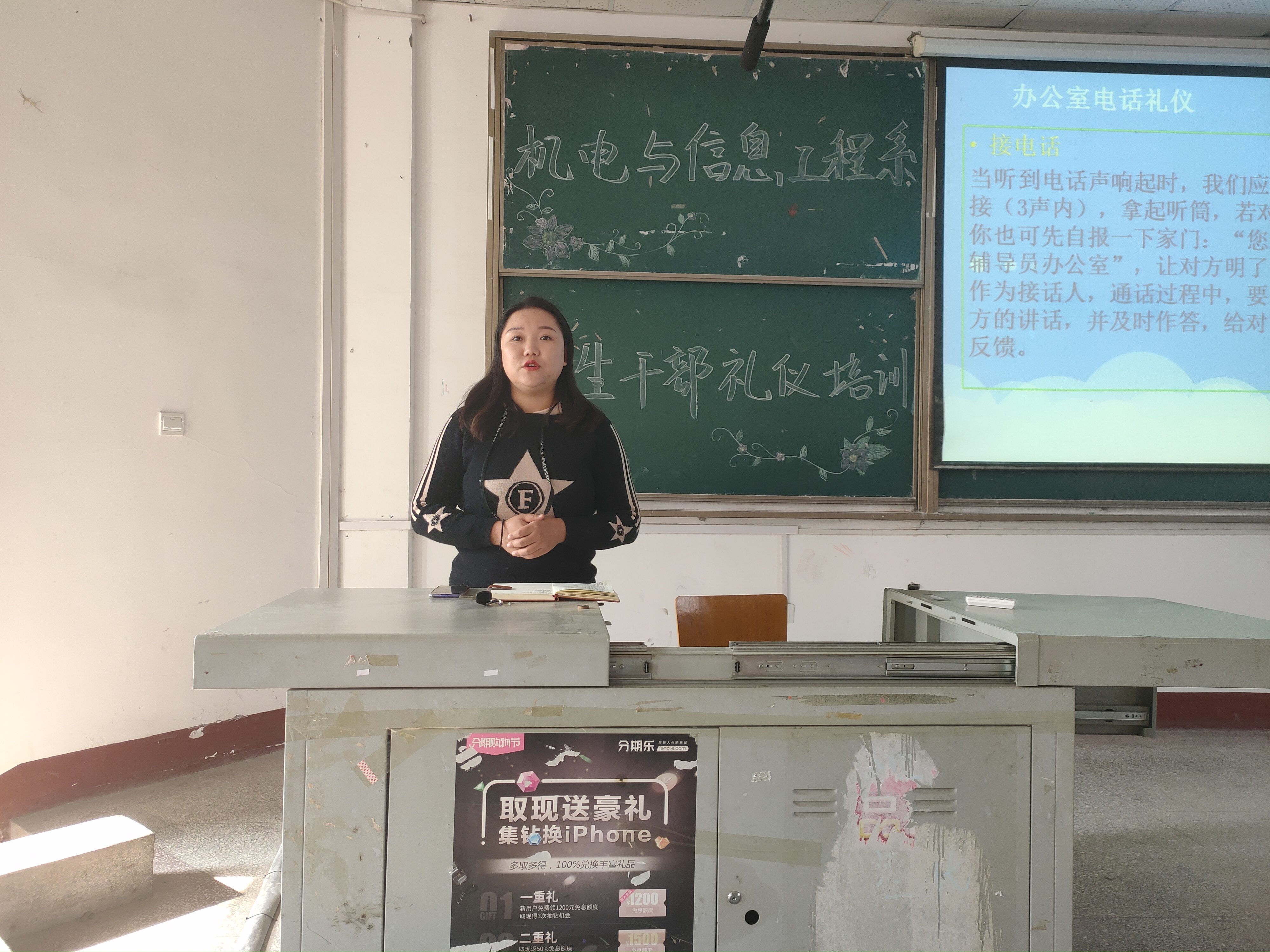 本网讯(员工记者 刘文婷)近日,在西校区四教106、300教室,我系分别举行员工干部演讲与礼仪培训活动。活动由学习部张杰主持,系辅导员王琳出席并担任礼仪培训主讲人。第十五届团学组织全体成员一同参与。