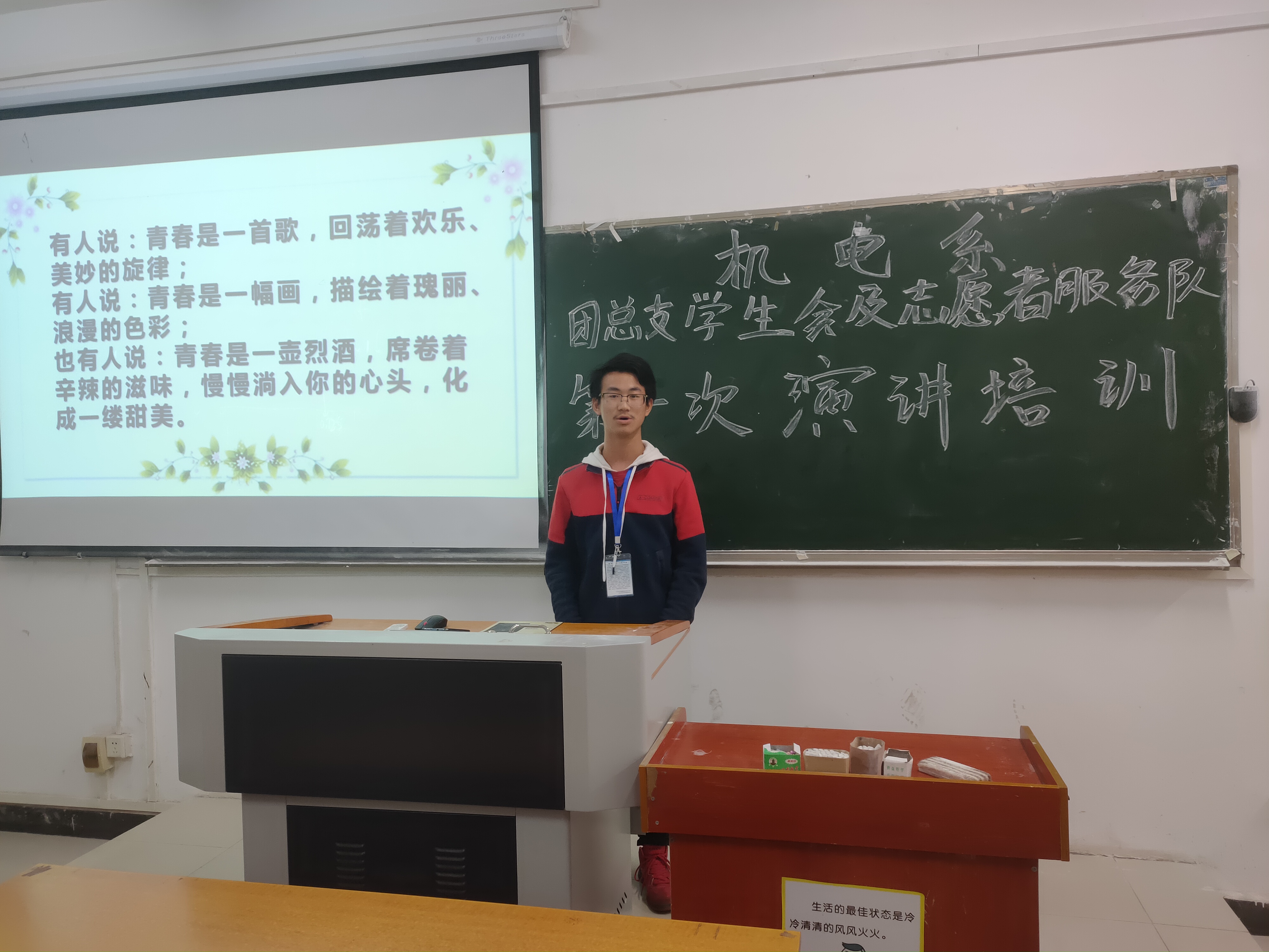 演讲培训上,我系团学组织各部门分别选派两名成员,围绕“青春—责任—奉献”、“虚心有时是一种修养的表现”两大主题,结合PPT展示阐述自己的观点。各选手依次上台演讲,通过列举名人事迹和身边行为对主题做详细讲解。随后,主席团成员与各部门部长分别对选手进行点评。
