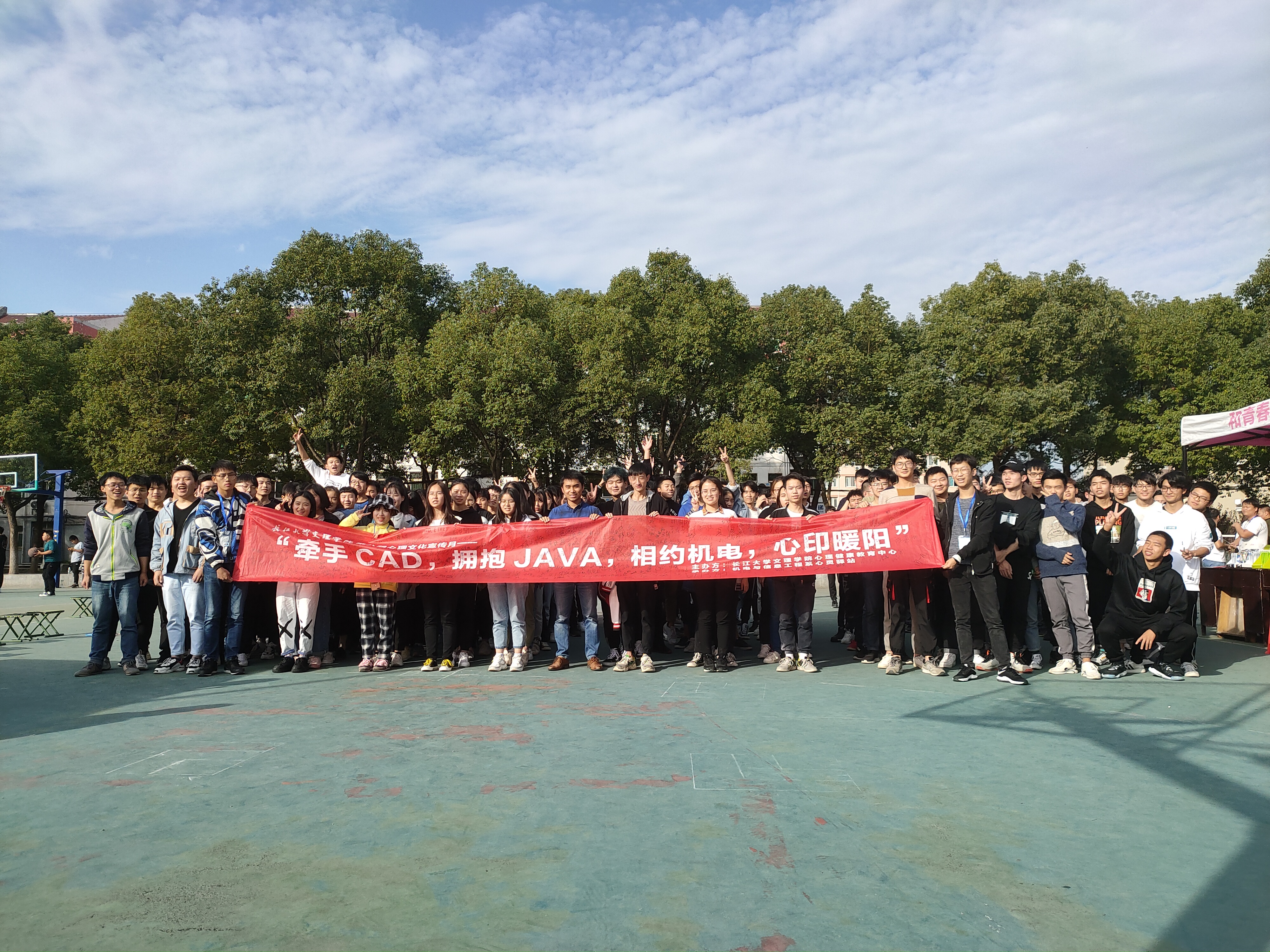 本网讯(员工记者 刘文婷)11月14日中午,在西校区风华园操场,我系开展以“牵手CAD,拥抱JAVA,相约机电,心印暖阳”为主题的老员工心理文化宣传户外团辅活动。秘书处付锐、程继松、黄晓菲担任主持,五百余名师生共同参与。