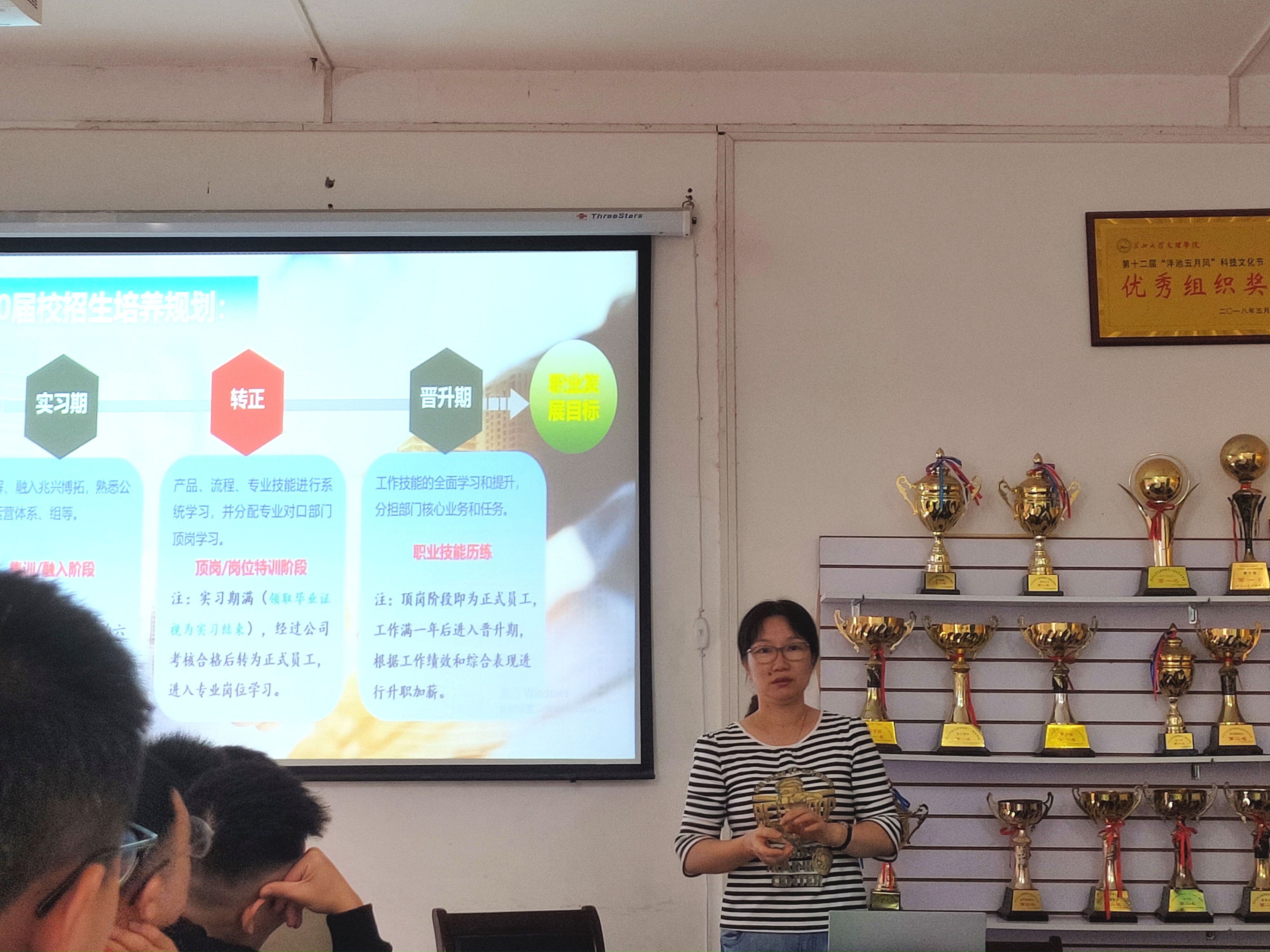 招聘会上,该公司人事经理吴阳涛向同学们详细阐述该公司的基本概况、工作环境、特色活动、岗位需求、常规薪资等内容,并结合自身工作经历分享职场就业经验,对该公司的招生培养规划、晋升、企业文化、招聘职位等方面予以讲解。宣讲后,该公司对有意愿的的同学组组了现场测验。招聘活动在同学们热烈的掌声中圆满结束。