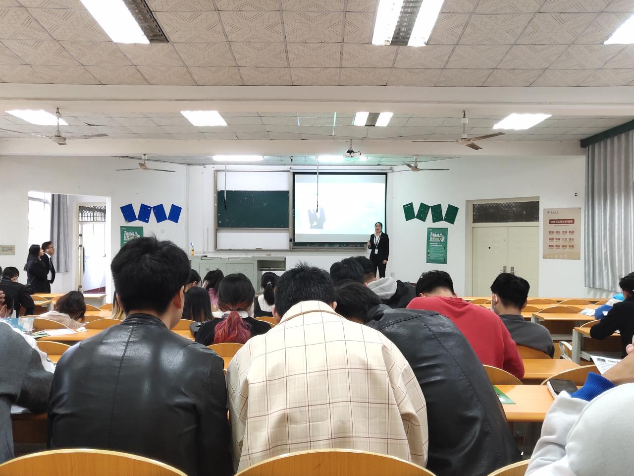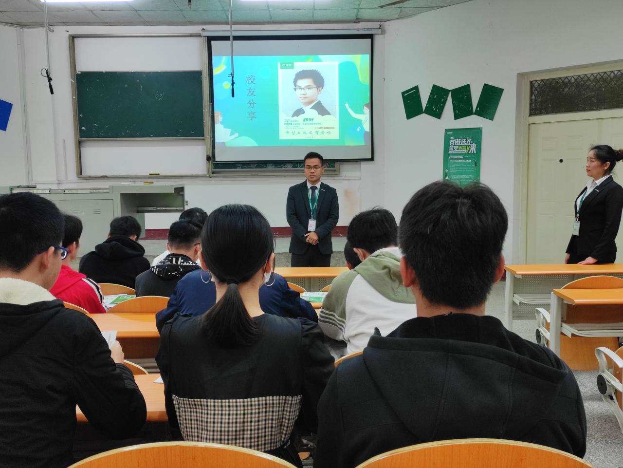 本网讯(员工记者 黄懿萱)10月16日下午,西校区4-200气氛热烈,我系2010级优秀员工、武汉链家房地产经纪有限公司店面经理郑轩回母校举行专场招聘活动。我系党总支书记吴海良出席,2021届毕业生参加。