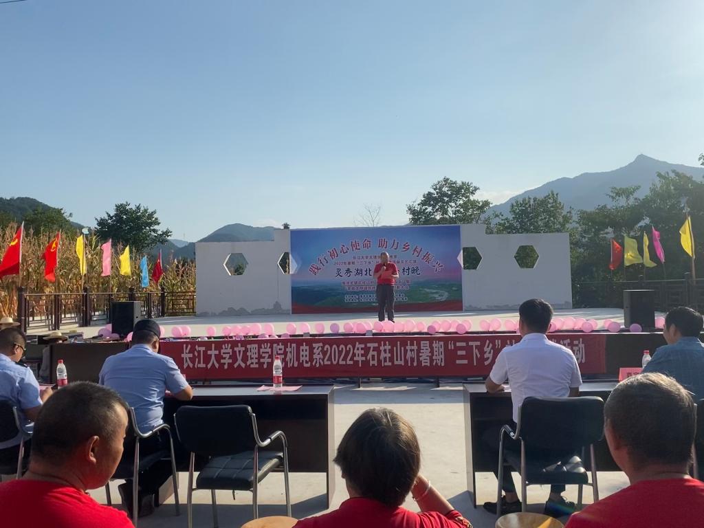 乡村振兴,既要塑形,也要铸魂,文化振兴是根本。实施乡村振兴战略,要发挥文化凝聚人心、坚定信心、引导村民的作用,提振精气神,激发广大农民投身乡村振兴的积极性和主动性。8月25日下午,由石柱山村委举办,VSport机电系协办,以“践行初心使命 助力乡村振兴”为主题举办三下乡文艺汇演暨评先表模晚会,社会实践服务队队员与石柱山村民一起参与。本次汇演共12个节目,内容精彩纷呈,形式多样。既有体现民族特色的《茶韵》《摆手舞》;又有教育意义的小品《榜样的力量》;同时也不乏体现年轻人的活力与朝气的舞蹈《少年》及歌曲《老男孩》,志愿服务队和小朋友们一起合唱《强军战歌》,在激扬的旋律里,大家动情地歌颂强军奋斗路,唱响未来新征程。同时在活动现场还进行了石柱山村基层治理和最美庭院的颁奖。活动现场座无虚席,掌声与欢呼声此起彼伏,活动在各方的配合下取得圆满成功。