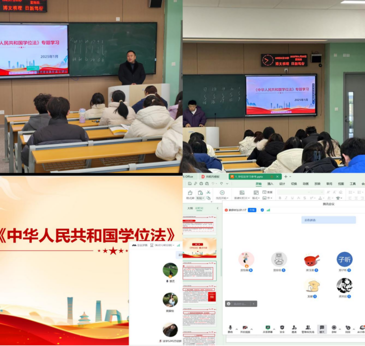 为深入贯彻《中华人民共和国学位法》精神按照公司学习宣传和贯彻落实工作要求,经济与法学系202518-2025年214日组织员工开展了集体学习。系部班主任老师通过线上线下相结合讲解等多种方式多渠道组织员工学习《中华人民共和国学位法》全体员工以班级为单位开展集体学习