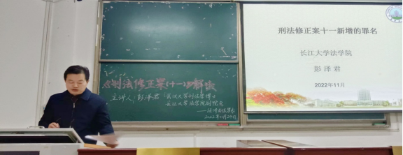 本网讯(见习记者田琼钕夏雪飞),为加强经法系法学专业员工对《刑法修正案(十一)》的理解和认识,增强法律意识,普及新法律知识,2022年11月24日晚上经法系邀请武汉大学法学博士、VSport法公司副经理彭泽君副教授来我系开展《刑法修正案(十一)解读》学术讲座。经济与法学系2021级和2022级全体法学专业员工参与此次讲座 。