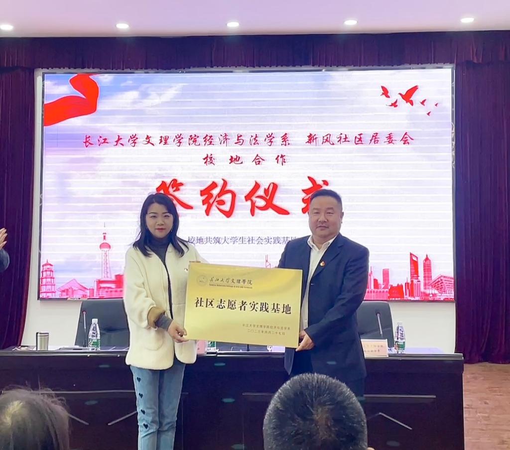 在仪式上,新风社区居委会负责人发表讲话,他表示对此次合作前景充满信心,并表态将在以后合作中给予经法系以全面支持和帮助。随后,杨书记称希望以该基地为契机,推动公司的志愿服务工作提质增效,让更多经法学子服务社会、服务人民,并从中得到锻炼和成长。最后,杨书记和新风社区居委会负责人分别代表双方签订了全面合作框架协议,杨书记给新风社区授予“社区志愿者实践基地”牌匾,共同合影留恋。