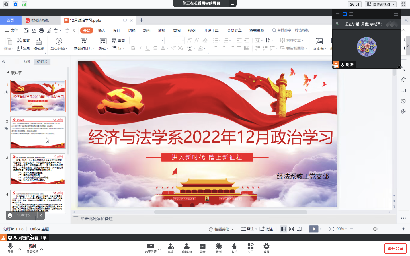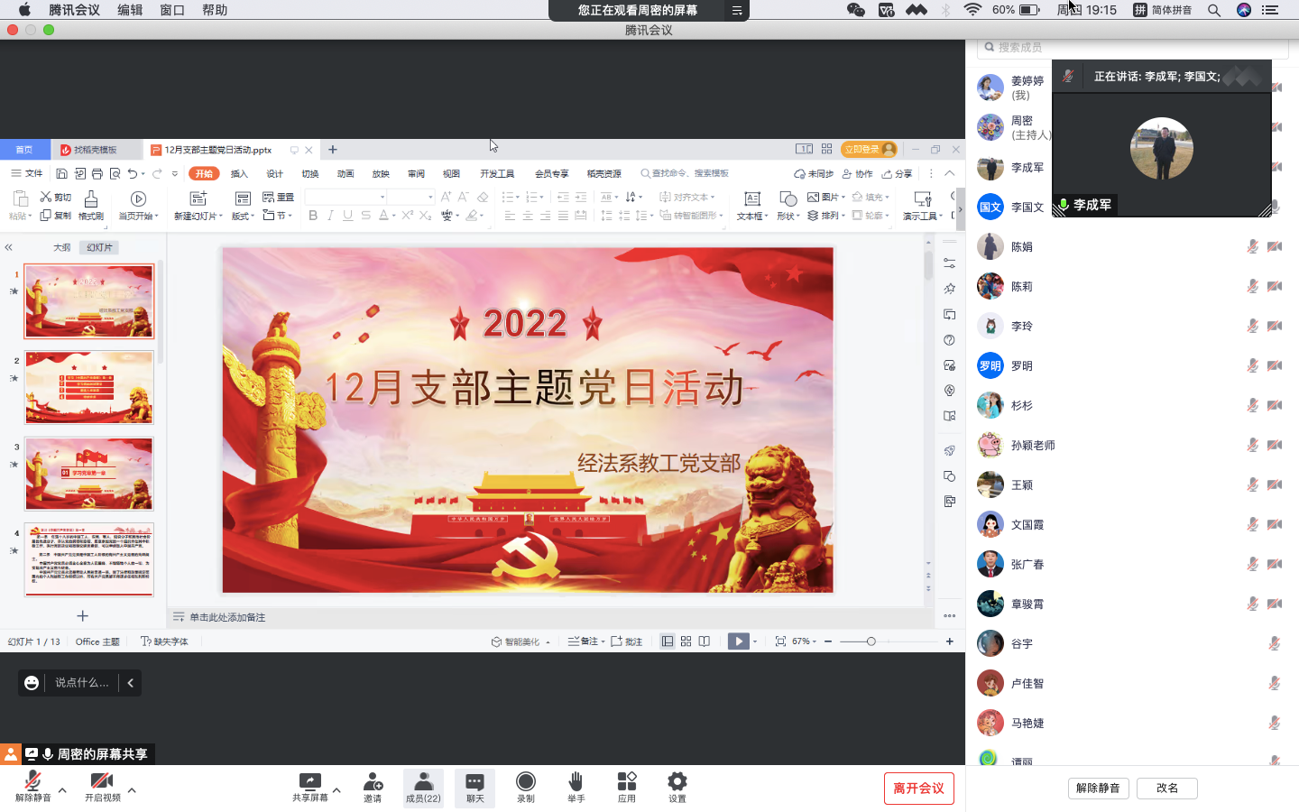 12月15日下午19:00,经法系全体教职工在腾讯会议平台开展12月政治学习和支部主题党日活动。会议由党总支书记李成军主持。