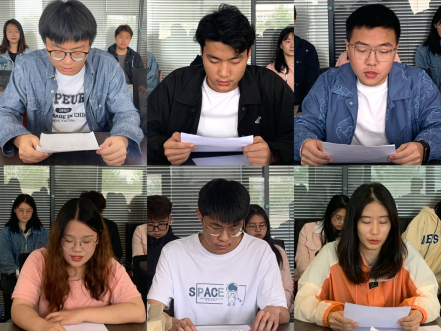 拟转正的八名预备党员同志依次发言(上排:郁鑫、肖鹏、朱必权 下排:高梦婷、舒远旺、吕诗曼)