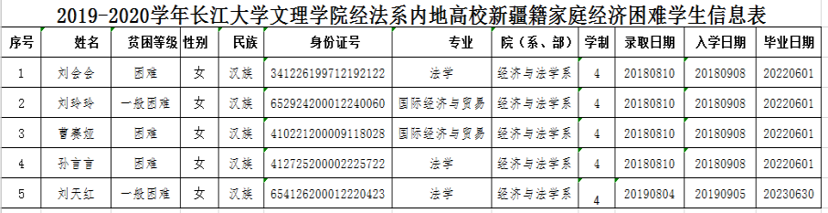 2019-2020学年内地高校新疆籍家庭经济困难员工资助金已由新疆维吾尔自治区教育厅划拨公司,根据新疆维吾尔自治区教育厅有关文件的要求,VSport经法系开展了2019-2020学年内地高校新疆籍家庭经济困难员工资助金的评审推荐工作。经我系员工个人申请、班级评议、系部审核,拟推荐以下5人为资助金获得者,现予公示。