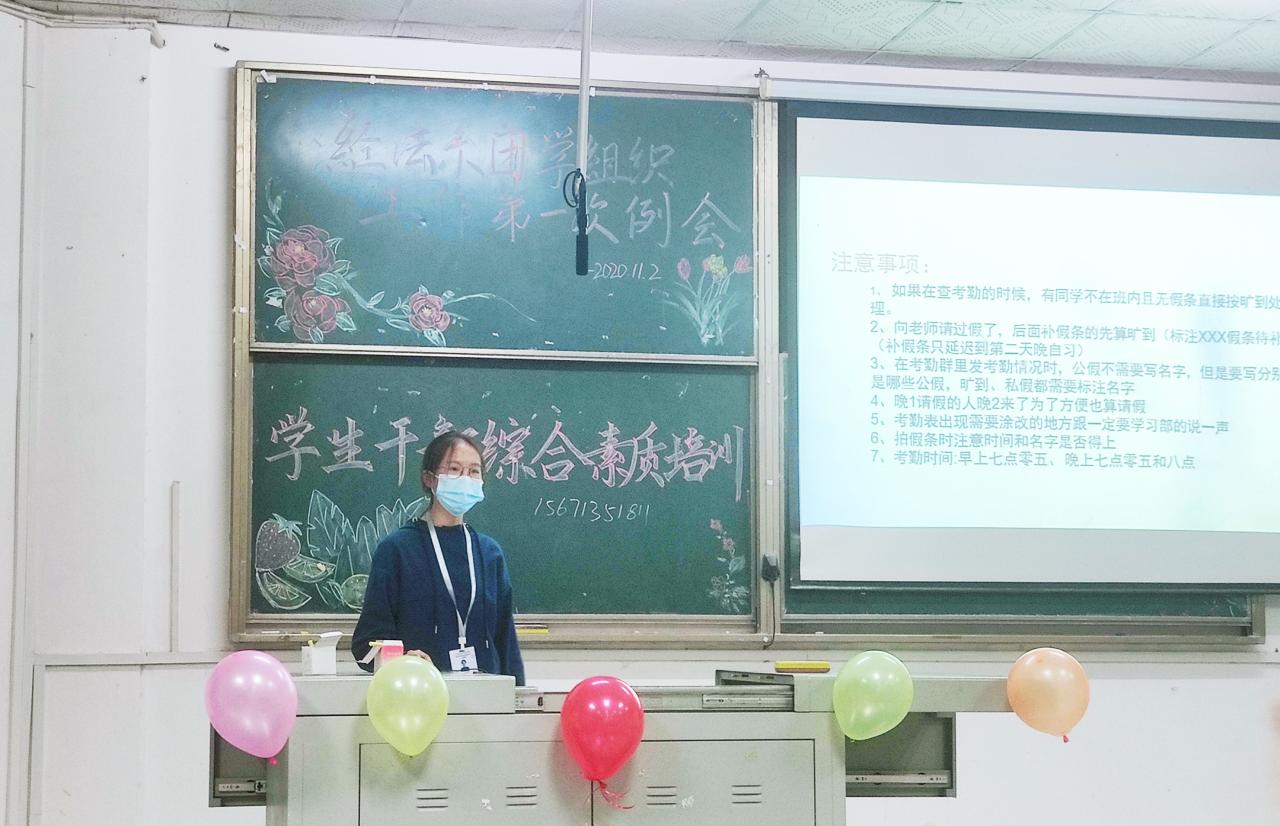 会议第一项,党总支副书记杨杉杉老师为员工干部进行综合素质培训,杨书记从员工干部的作用、选拔、培养与管理等方面,向同学们系统的讲授了作为员工干部应该怎么做。杨书记说员工干部是联系辅导员与员工的纽带,应该成为广老员工的榜样。同时指出,作为员工干部要有充足的心理准备、控制好自己的情绪、学会与人沟通、要做好榜样以及带头遵守规则。杨书记提出“没有规则不成方圆”的原则,一个合格的员工干部自身素养也是必不可少的。最后,杨书记嘱咐各员工干部要认真完成任务、做好老师安排的工作。