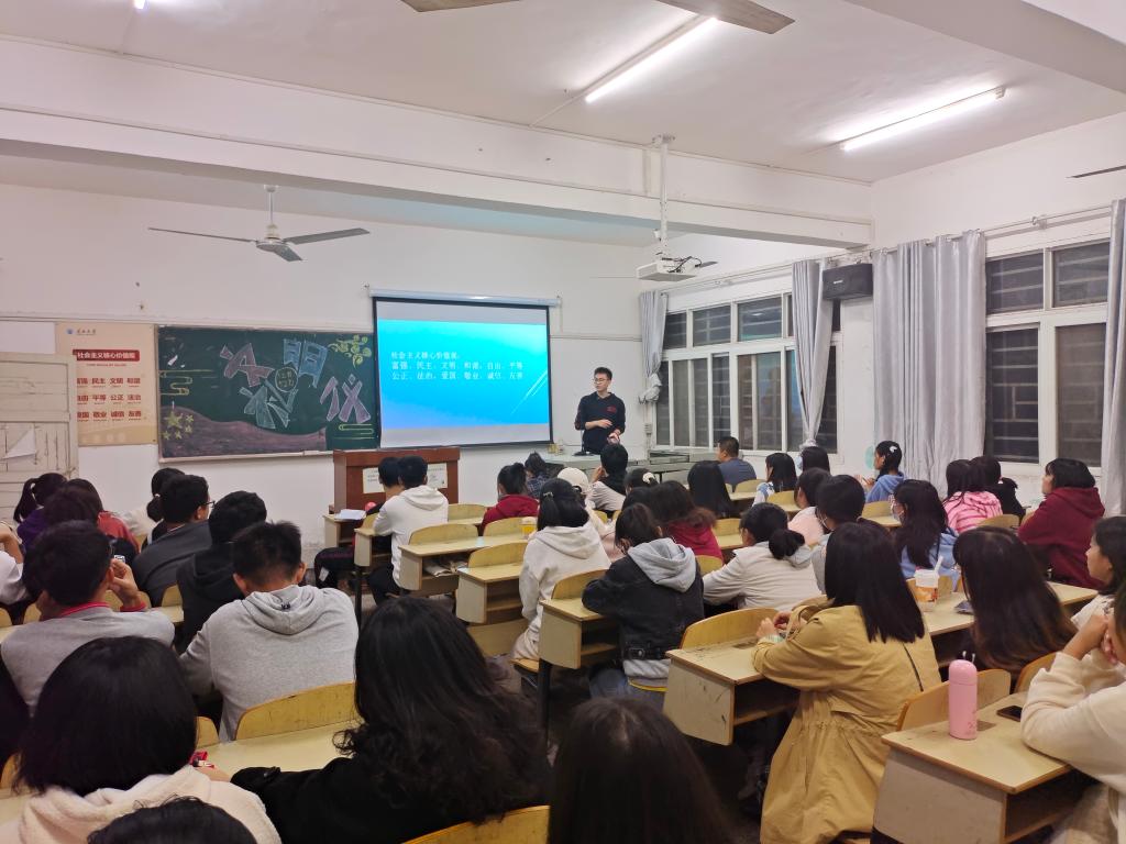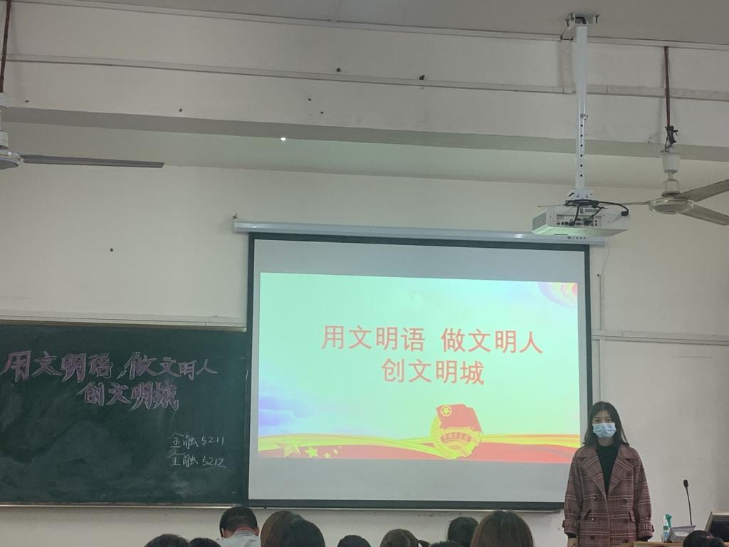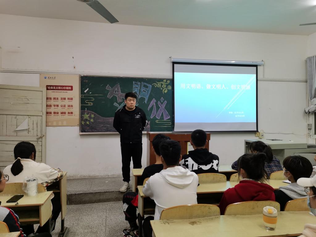 本次班会主题是“用文明语,做文明人,创文明城”,班会上大家一起重新学习了社会主义核心价值观和实现国家富强、民族振兴、人民幸福的中国梦,以及秉持奉献、友爱、互助、进步的志愿者精神。