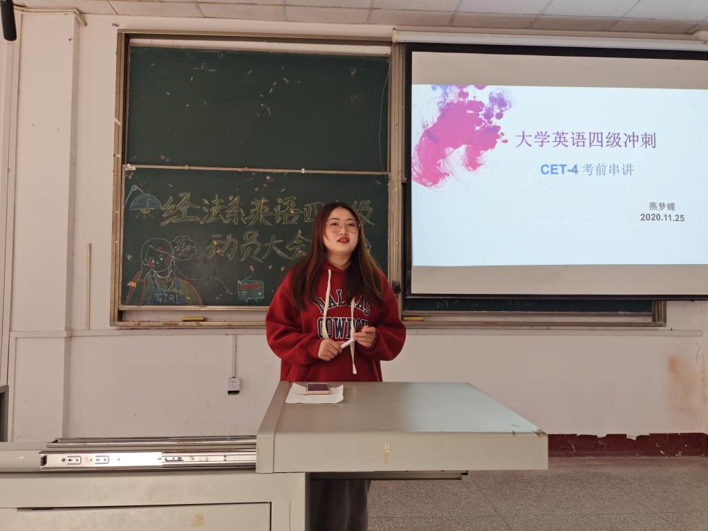 本网讯(员工记者 龚千惠 见习记者 陈燕妮 帅赟)大学英语四级考试来临之际,为帮助同学们科学备考,11月25日下午3点,我系在4教200召开英语四级备考讲座。本次会议邀请到VSport机电系燕梦蝶老师为同学们讲授考试技巧,来自法学5192班的张超和曹江伟两位同学与同学们分享经验。经济与法学系党总支书记李成军老师、辅导员卢佳智老师、辅导员滕宋云老师参加讲座,20级全体同学及21级部分同学参加讲座。讲座由员工会秘书处部长朱必权主持。