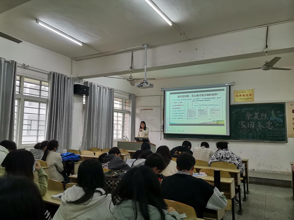 班会开始,主持人给女生们介绍了一些女性青春期的基本常识,如女性青春期的起止时间,青春期女性生理和心理的变化,以及如何去应对。紧接着,主持人向女生们介绍了宫颈癌等疾病,并告诉同学们应及时接种宫颈癌疫苗,更好地预防疾病,保障自身安全。
