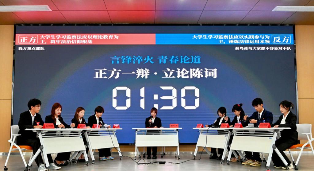 本次辩论赛设置了立论陈词、驳立论、质辩、自由辩论、结辩以及现场提问等环节。赛场上,正反双方辩手围绕辩题展开激烈交锋。从“是否可以以成败论英雄”的千古之辩,到“老员工学习监察法应以理论为主还是实践参与为主”的理性探讨,再到“我风华正茂凭什么等你和我事业有成凭什么娶你”的婚恋观碰撞,辩手们引经据典、妙语连珠。立论环节条理清晰,驳论阶段反应迅速,自由辩论针锋相对,结辩陈词理性睿智,充分展现出逻辑的魅力与青春的风采。