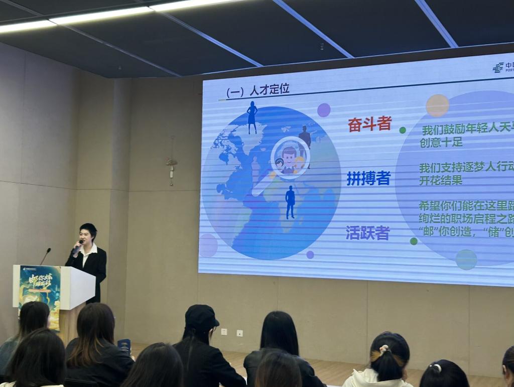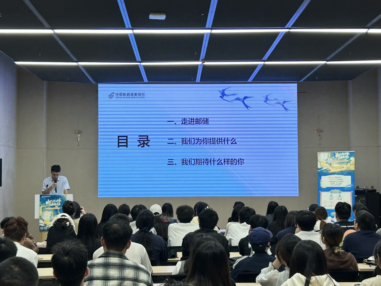 为深化校企合作,搭建员工与优质金融企业的就业链接平台,助力学子精准把握就业机遇,我系联合中国邮政储蓄银行股份有限公司荆州市分行于9月18日在图书馆103报告厅举办了校园专场宣传会,系党总支书记辛裕、辅导员刘曼莹、就业指导处相关人员、邮储银行荆州分行宣讲团队及2026届毕业生共同参与。