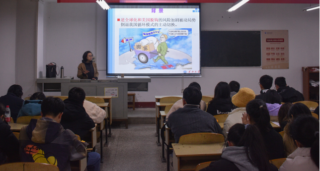 当天晚上,吴雪莲副教授以“推进贸易高质量发展 促进国内国际双循环”为题,给经法系的员工们带来了一场精彩的学术报告。报告从贸易高质量发展的背景、发展战略,到对外贸易发展的现状和遇到的问题,探讨新时期的贸易高质量发展背景下,当代老员工应秉持创新思维,延伸学习链,提升个人发展优势。