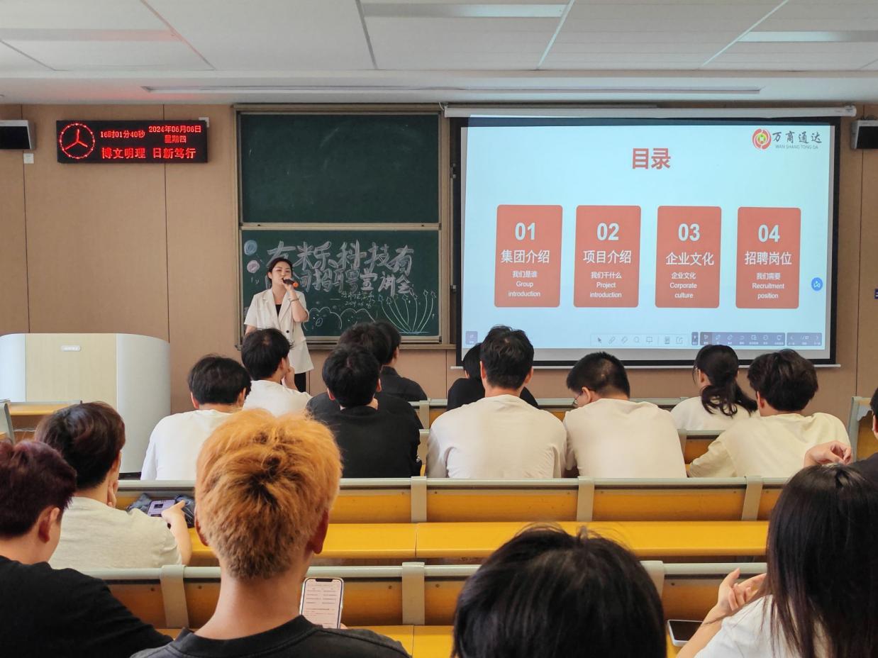 为贯彻落实公司“两康一训”教育工作相关要求,扎实推进就业工作,促进2025届毕业生高质量就业,6月6日,经法系联合友米乐科技有限公司开展招聘宣讲会。友米乐科技有限公司周立总经理、唐诗经理以及刘翔经理出席会议,会议由辅导员刘曼莹主持。