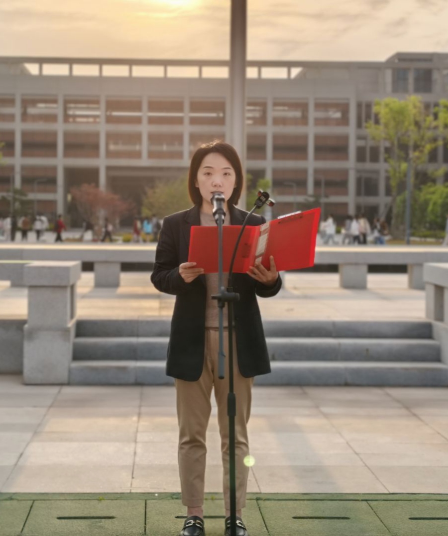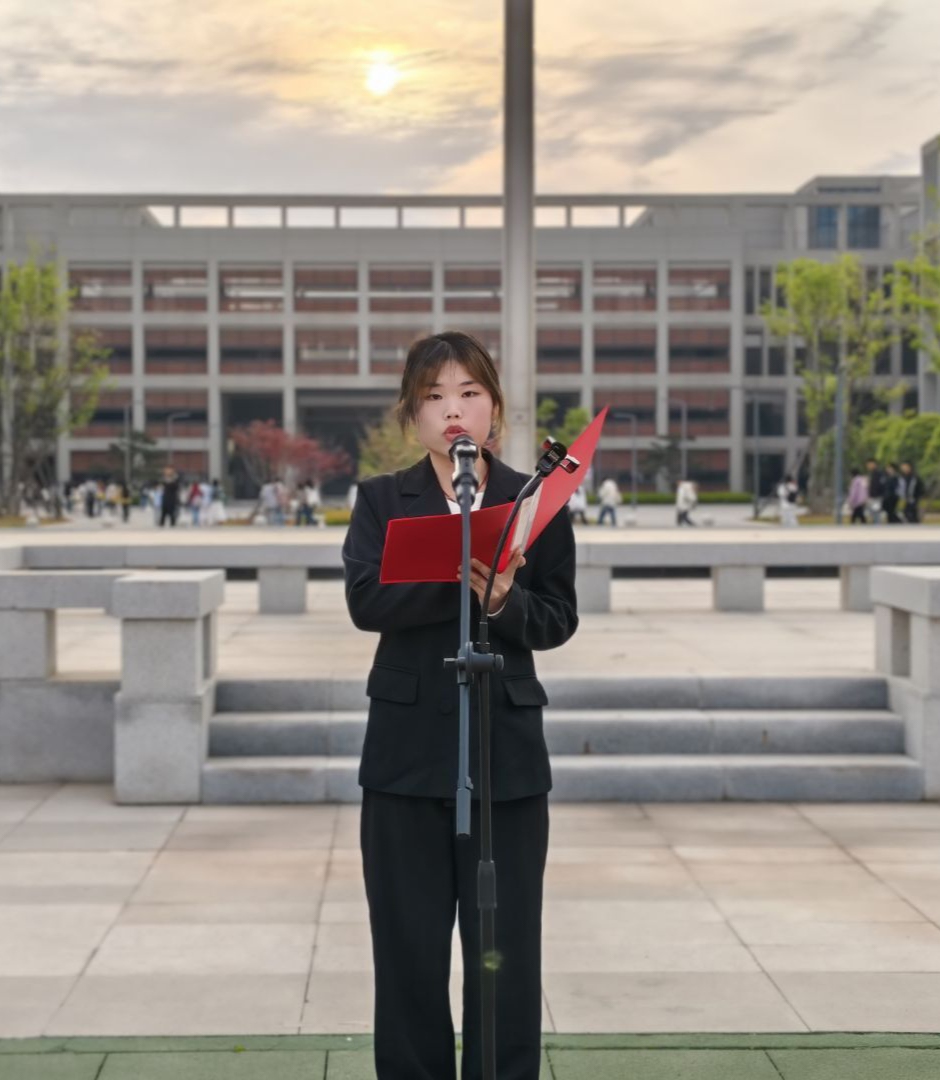 随后,进入大会第二项,经济与法学系志愿者服务队队长胡语繁作为员工代表发言。她呼吁同学们 “以星火之微光照亮未来,以青春之热血点燃奋斗之火”,着重指出新时代青年应立足专业知识,积极服务社会,将个人理想融入国家发展大局,用实际行动诠释责任与担当,引发了在场师生的强烈共鸣。