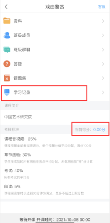 4.查看当前成绩。在课程页面,点击【更多】,可以清晰地看到成绩权重和当前得分,单击学习记录可查看详情。