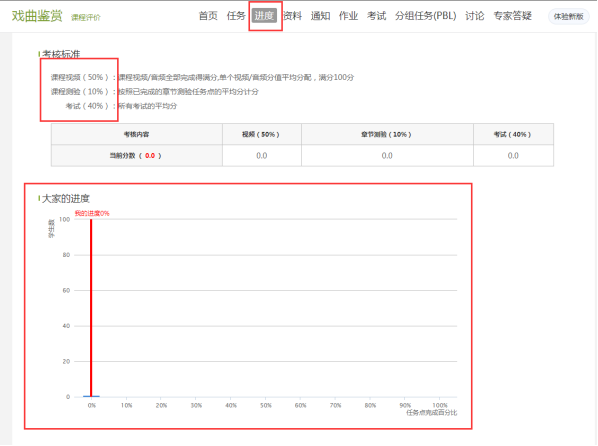 单击课程进入课程首页、点击导航栏中“进度”查看成绩权和当前分数。