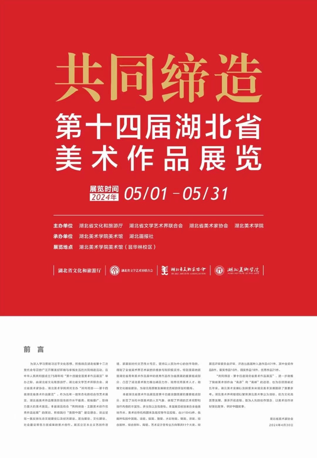 本届美术作品展览由湖北省文化和旅游厅、湖北省文学界联合会、湖北省美术家协会、湖北美术公司共同主办。作为五年一届常态化的综合性艺术展览,湖北省美术作品展是阶段性创作水平最高、规模最广、影响力最大的美术展览。