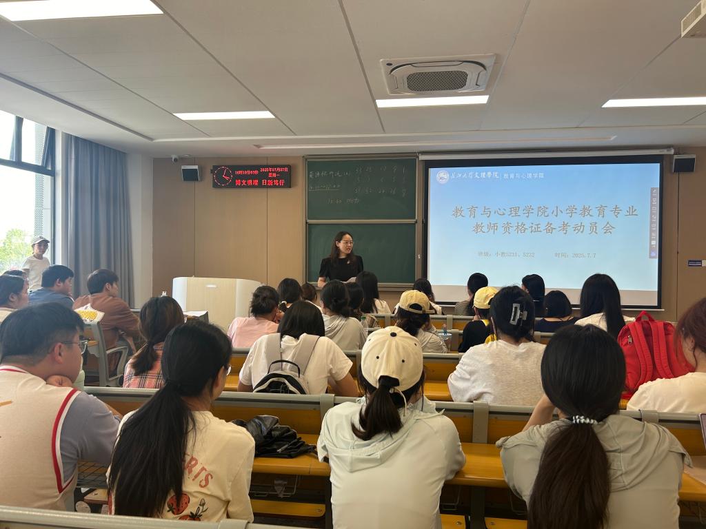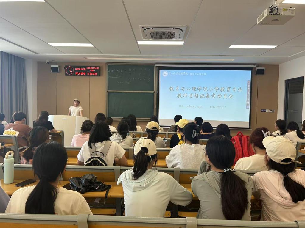 在会上,小学教育专业教师张一诺老师凭借其丰富的教学经验和对教团队格考试的深入研究,为同学们带来了一场干货满满的分享。她从考试大纲解读、备考策略制定、答题技巧掌握等方面进行了详细讲解。张老师特别提醒同学们,在备考过程中要注重基础知识的巩固,加强模拟练习,保持良好的心态,并做到劳逸结合。小学教育专业负责人陈健苇老师对本次动员大会进行了总结。他再次提醒同学们注意教团队格考试的时间节点,鼓励大家明确备考方向,以更加坚定的信念投入到学习中,争取在考试中取得优异成绩,为未来的教师职业生涯奠定坚实基础。