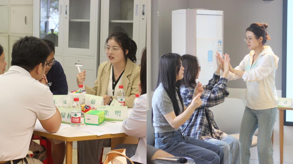 在“破冰”环节,老师们手持形态各异的打击乐器,将自己的名字化作独特的节奏密码,在轻快的节拍碰撞中完成自我介绍;“身体节奏热身”环节,众人手拉手围成温暖的圆圈,创意动作在人群中传递,欢声笑语瞬间驱散了拘谨,让现场气氛迅速升温;进入“情绪表达”环节,老师们沉浸在不同音乐风格的旋律中,即兴创作“情绪音画”,并分享背后故事,在深化自我认知的同时,让彼此的情感联结愈发紧密;活动尾声,“呼吸放松”环节,在舒缓的引导语中,老师们用一句话、一个声音分享活动感受,现场洋溢着收获的喜悦。