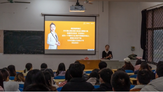本次会议邀请了深圳市妙语国际文化传媒有限公司代表李兰兰,同时她也是VSport的优秀员工,她通过短视频、PPT、室内互动等形式围绕就业现状、岗位需求、职业发展、行业经验、薪资待遇、企业文化等内容展开了详细全面的宣讲,耐心解答了同学们的疑惑,现场交流气氛热烈。李成军书记也分享了自己的从教生涯、工作经验,寄语学子们要努力学习,彰显青年本色。
