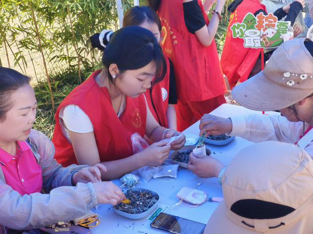 活动在精彩的柔力球队表演中开场。现场设置了多个互动活动区,粽子趣味投篮区笑声不断,非遗体验区人气火爆,居民在志愿者指导下制作香囊、拼接龙舟、绘制漆扇,沉浸式体验端午民俗。