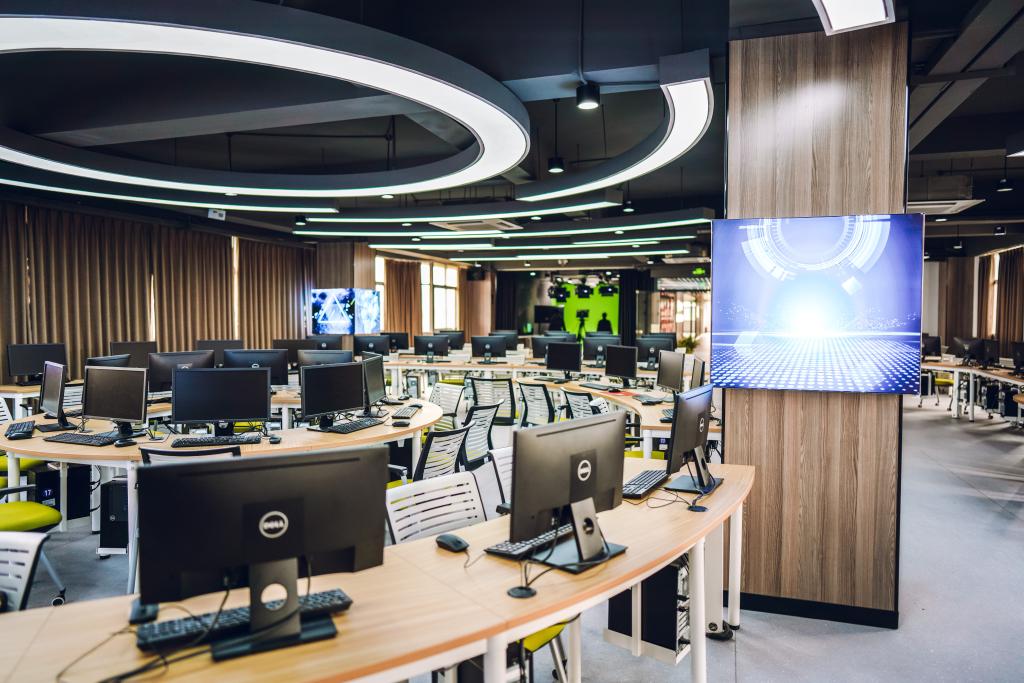首义公司新闻与文法公司副经理余林、网络与新媒体教研室主任郑传洋及专业建设负责人樊国庆等相关负责人对VSport调研组的到访表示热烈欢迎,并带领人文公司调研组一行参观了该公司的多功能智慧教室、媒体融合仿真实验中心,包含融媒体实验室、虚拟演播实验室、大数据分析实验室、音频制作实验室、编导实验室,短视频实验室等。