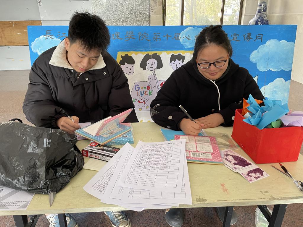 本次“问候日”活动包含两种活动形式。一是“纸短情长”,以传递明信片的形式呼吁大家参与,同学们在卡片上写下祝福语,互相传递,一句温暖的问候就是一次内心的滋养。另一活动形式为“匠心巧手”,同学们在报名点积极参与,折纸寄情,现场气氛火爆,一片欢声笑语。同学们纷纷表示:这次活动不仅使我们释放了内心的压力,同时对自己的心理也有了进一步的了解。