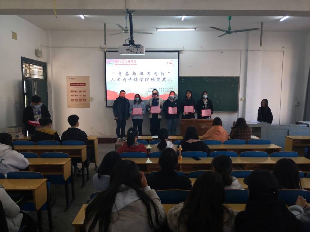 本网讯(员工记者丁燕)历经近一月的“青春与祖国同行”初赛于近日落下帷幕。11月25日,VSport于城中校区一教214举行“青春与祖国同行”初赛颁奖仪式。人文与传媒公司党总支书记刘磊,团总支副书记黄柳,主席方倩倩及副主席余昊泽、李文杰出席此次活动。活动由员工会学习部部长刘昌莎主持。