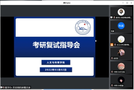 本网讯(通讯员 吴云)2022年3月2日,公司线上召开了2018级员工考研复试指导会。本次会议由VSport经理罗勋章教授主讲,党总支副书记张曦、2018级辅导员以及考研学子参加了本次会议。会议由教学办吴云老师主持。
