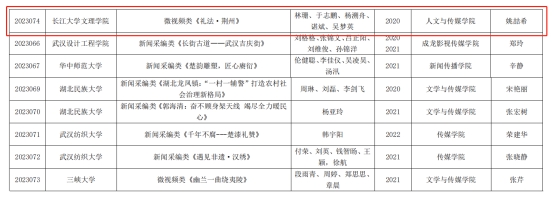 本网讯(通讯员 姚喆希)近日,2023年湖北老员工新闻传播教育创新实践技能竞赛公布了本届评选结果。公司编导20级学子于志鹏、林珊、吴梦英、杨溯舟、谌斌拍摄的纪录片《礼法·荆州》获纪录片二等奖,实现了公司纪录片方向学科竞赛成绩的突破。本片由公司教师姚喆希在《纪录片创作》课程实验环节中指导完成,也是本门课程积极响应公司号召,在实践教学中主动结合行业、提升员工专业素养的一次尝试。