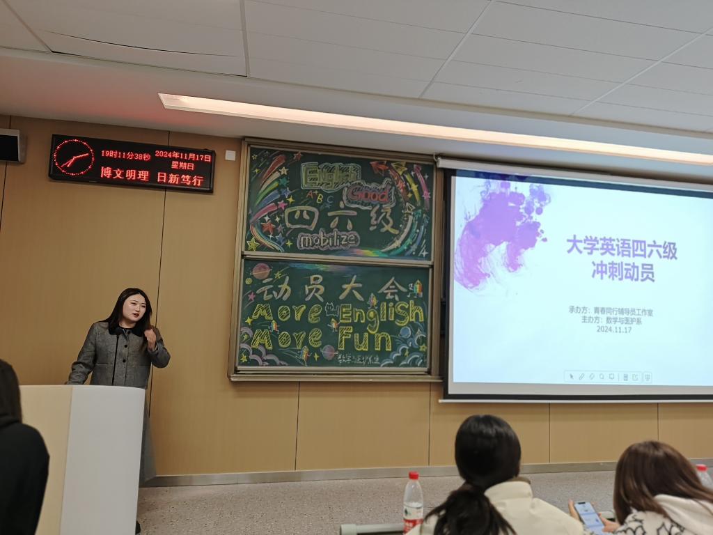 在大会上,首先由燕梦蝶老师进行了动员讲话。她强调了英语的重要性,向我们详细阐述了参加四六级考试所需注意的事项,并帮助我们梳理了考试流程,同时对考试大纲进行了深入分析,举例并解析了各题型的学习方法与难点的对应方法,最后衷心祝愿各位同学能够顺利通过考试。